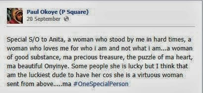 NEWS:Read Paul of  PSquare Loving Shout-Out To Fiancee Anita On Facebook